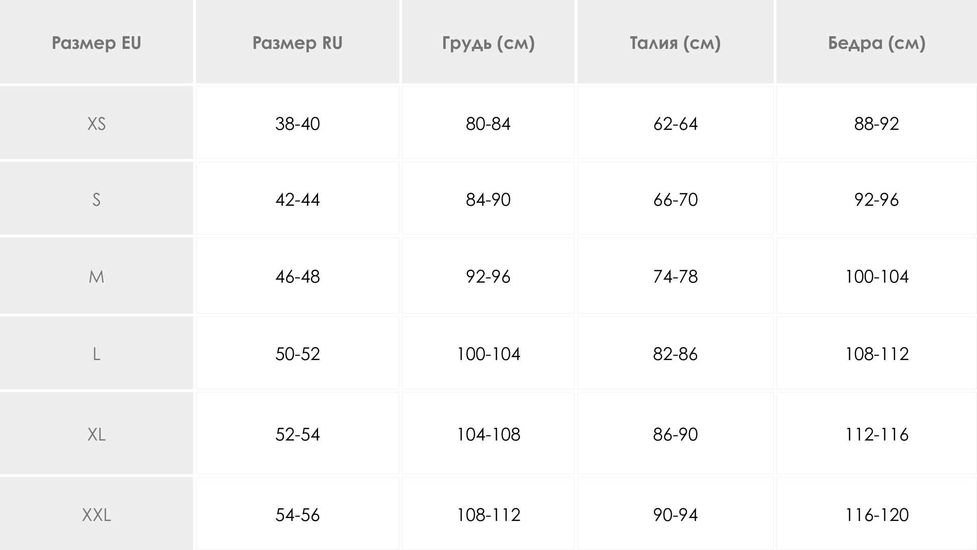 Таблица размеров
